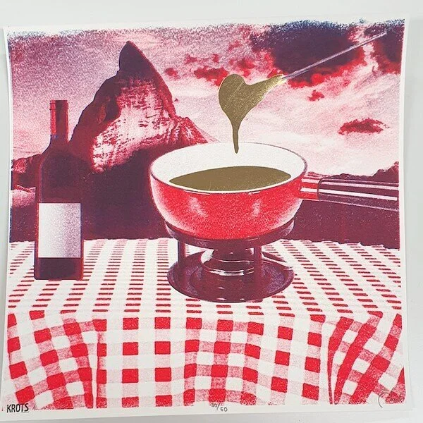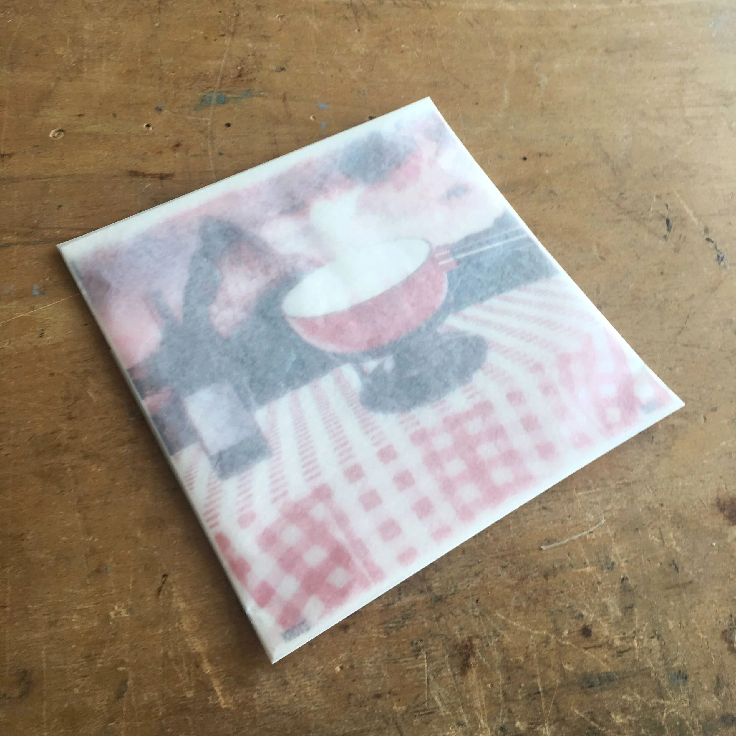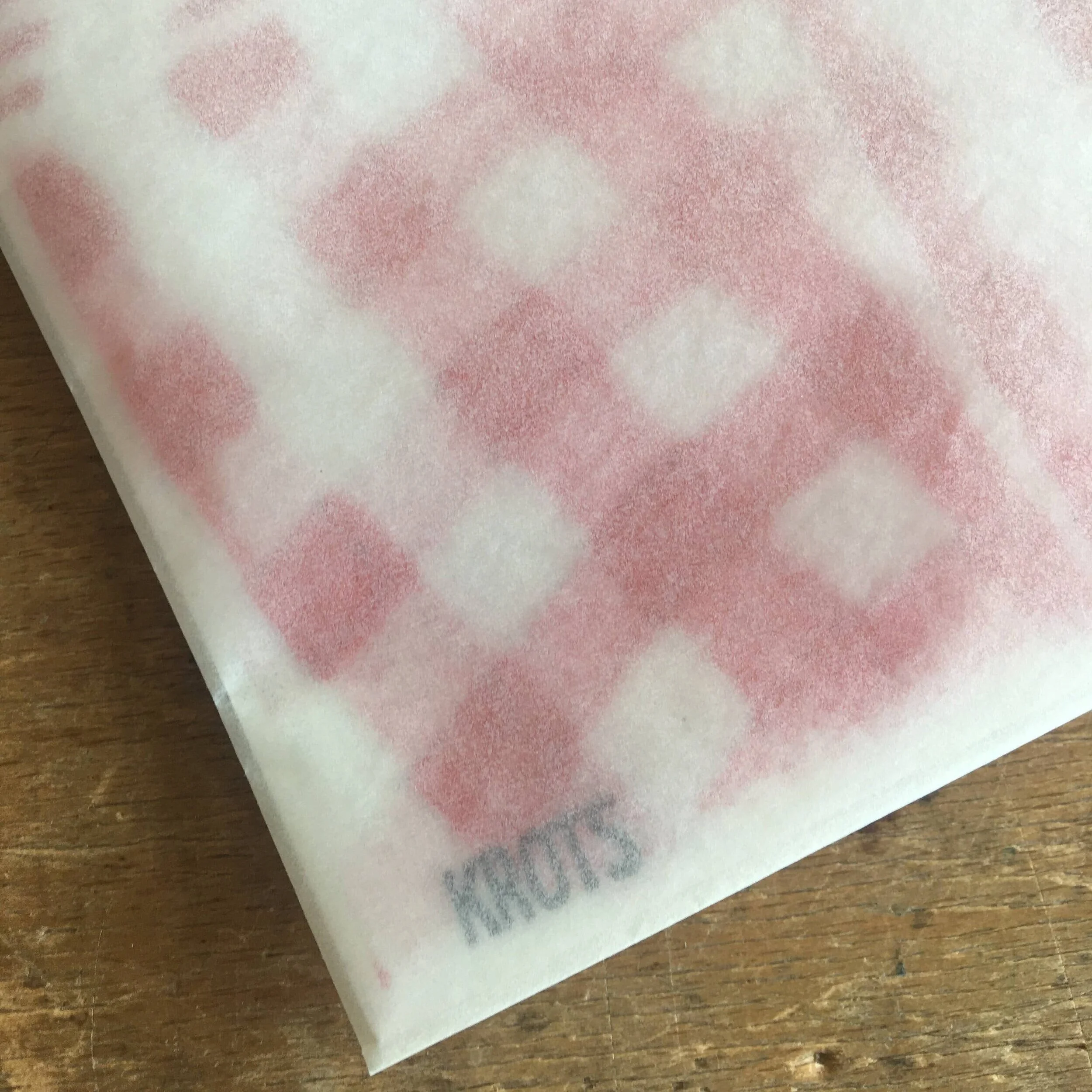 with risograph inks being vegetable-oil based and not completely self-drying, there is a risk of smudging when not handled carefully so we folded the print it to a translucent glassine paper as a protective envelope. love the matte look and the surprise of the shiny gold when opened.