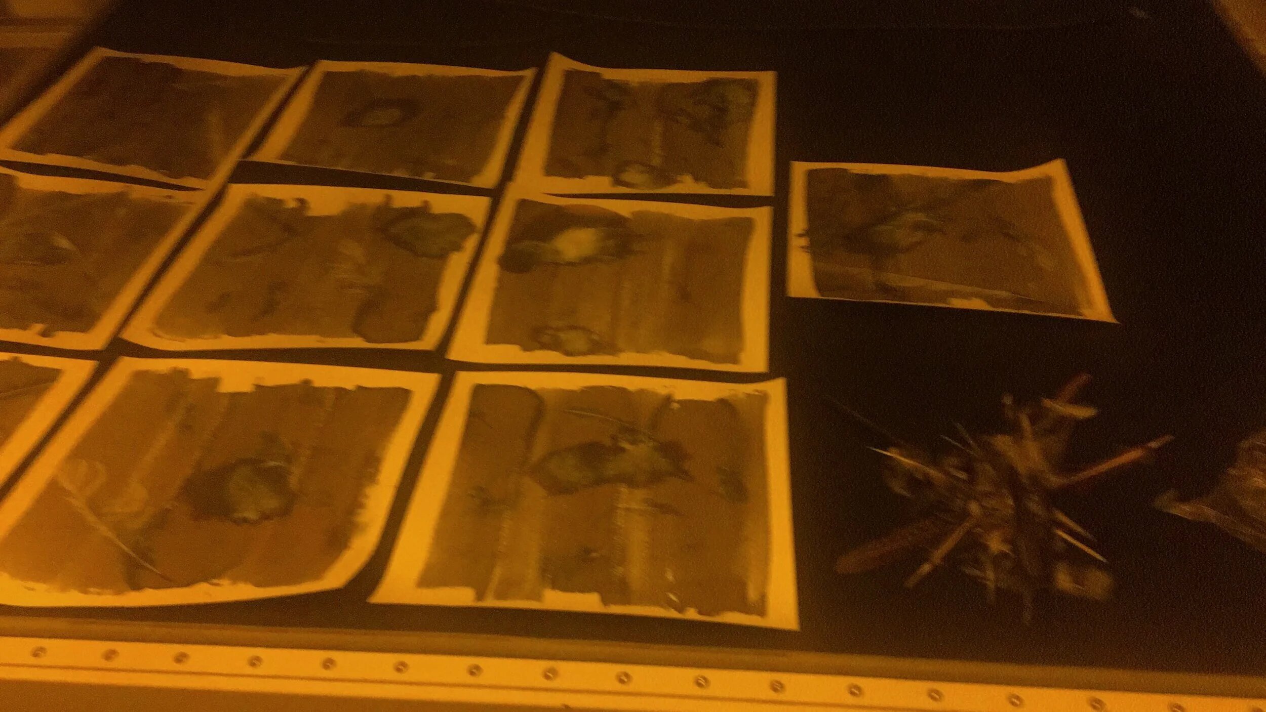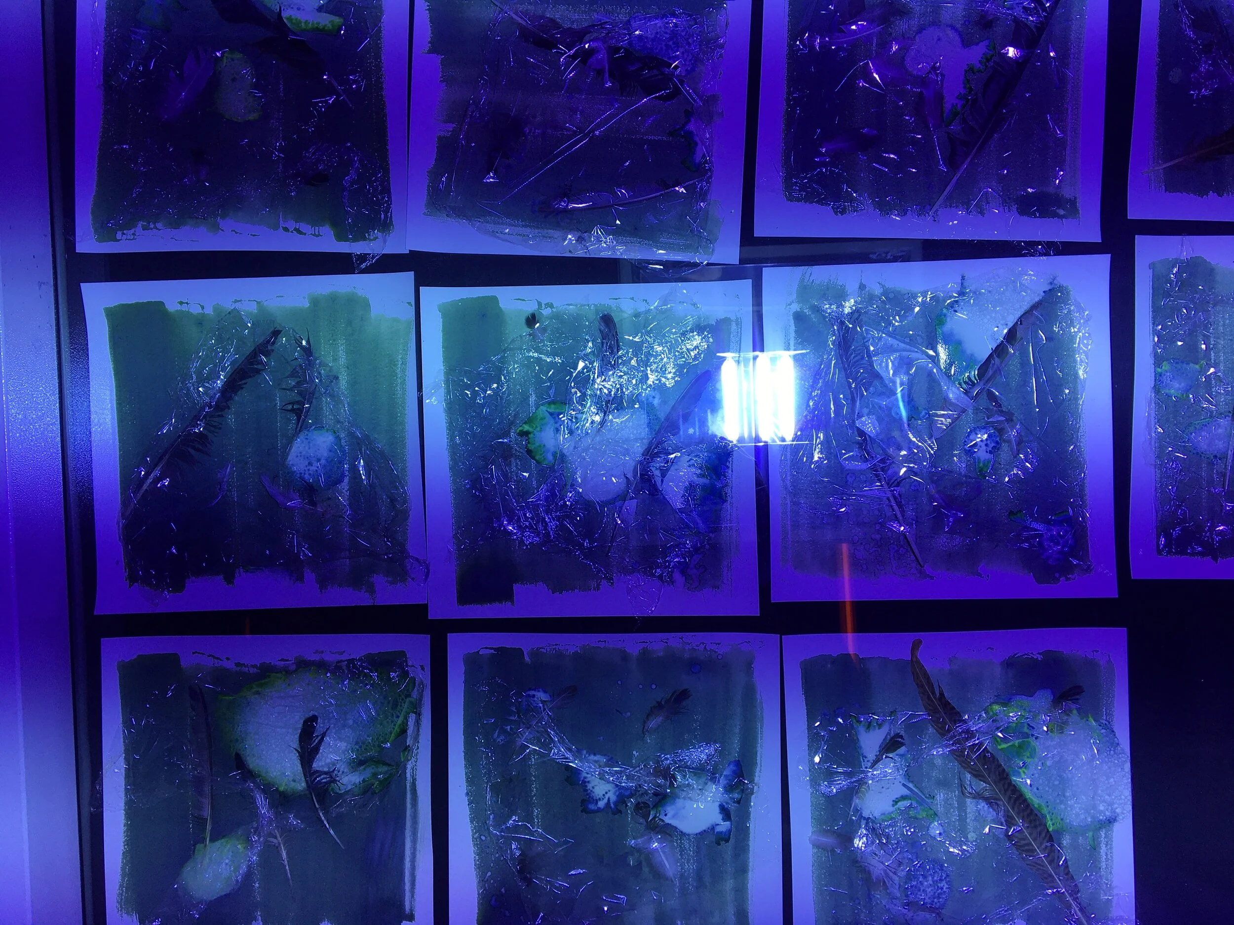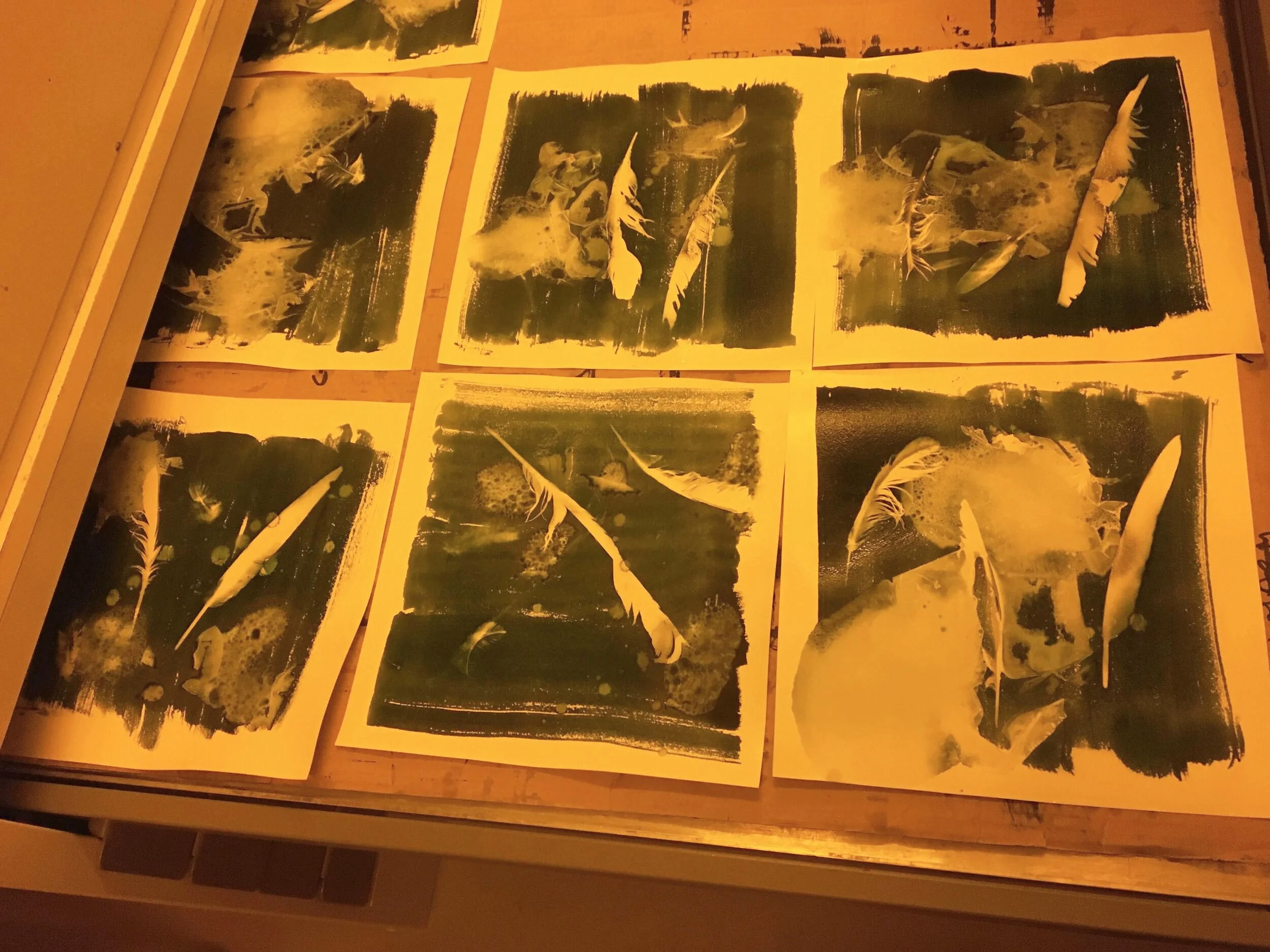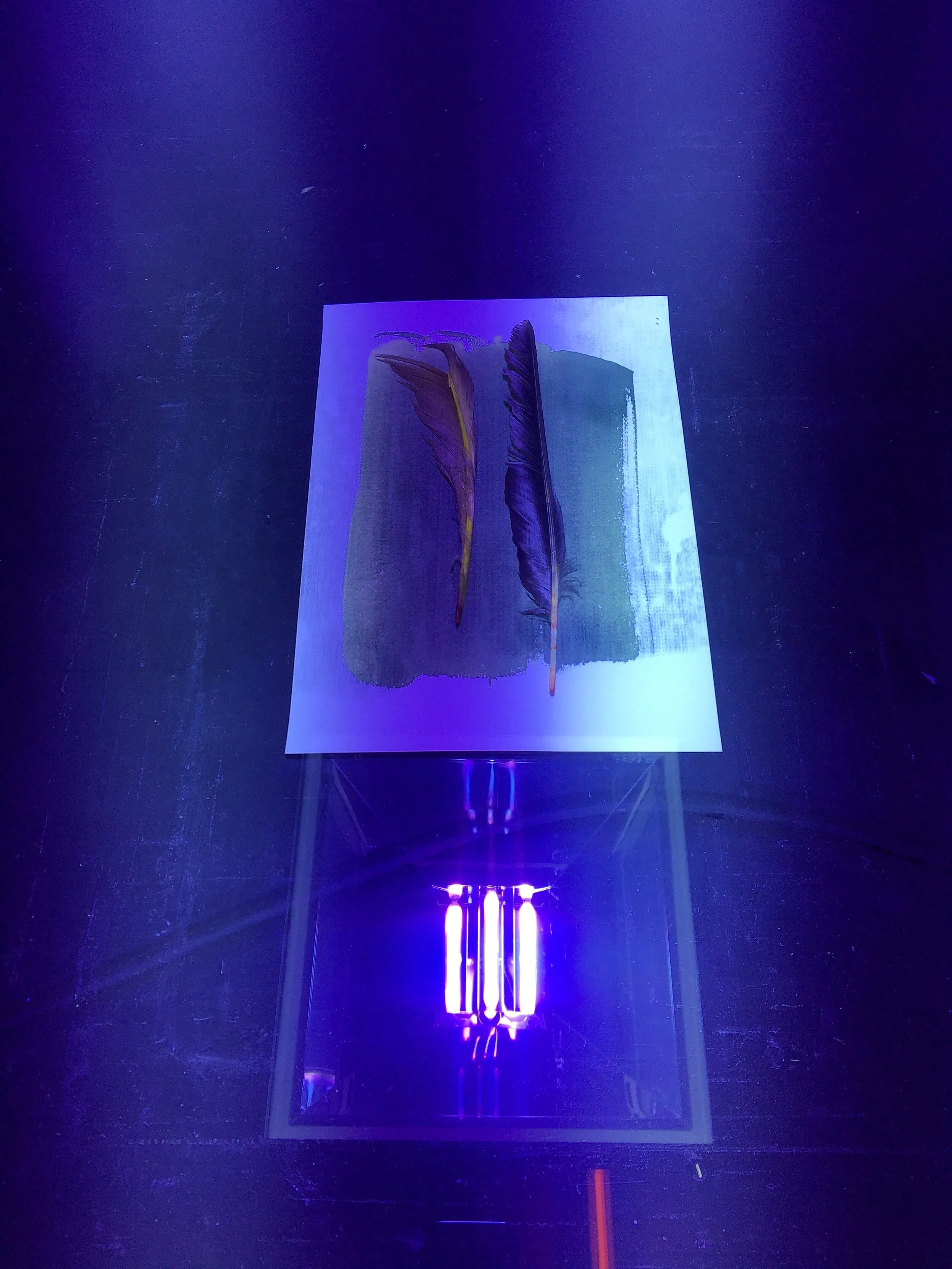 first exposure test, just feathers. for a cyanotype to work, you mix two chemicals that create a photosensitive solution that turns blue when exposed to light. so it’s practically like black and white photography but its blue and white. the great thing about cyanotypes is you can use it on pretty much any absorbent material.